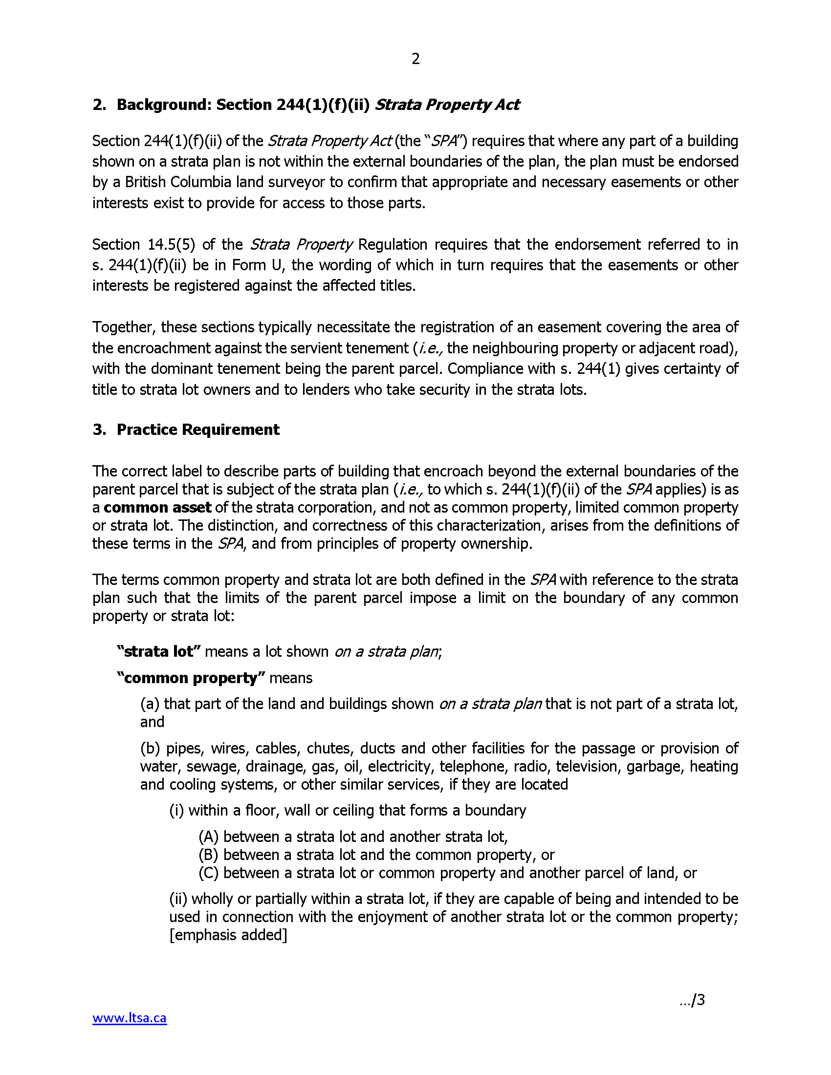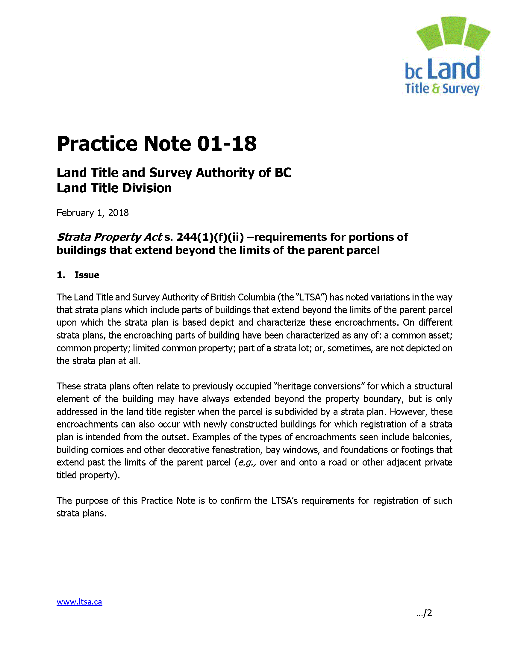 Strata Property Act S. 244(1)(f)(ii)–Requirements For Portions Of Buildings That Extend Beyond The Limits Of The Parent Parcel (Practice Note 01-18)